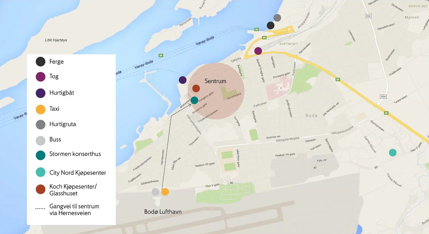 Reisetid: Ca. 5 minutter fra Bodø lufthavn til Bodø stasjon.